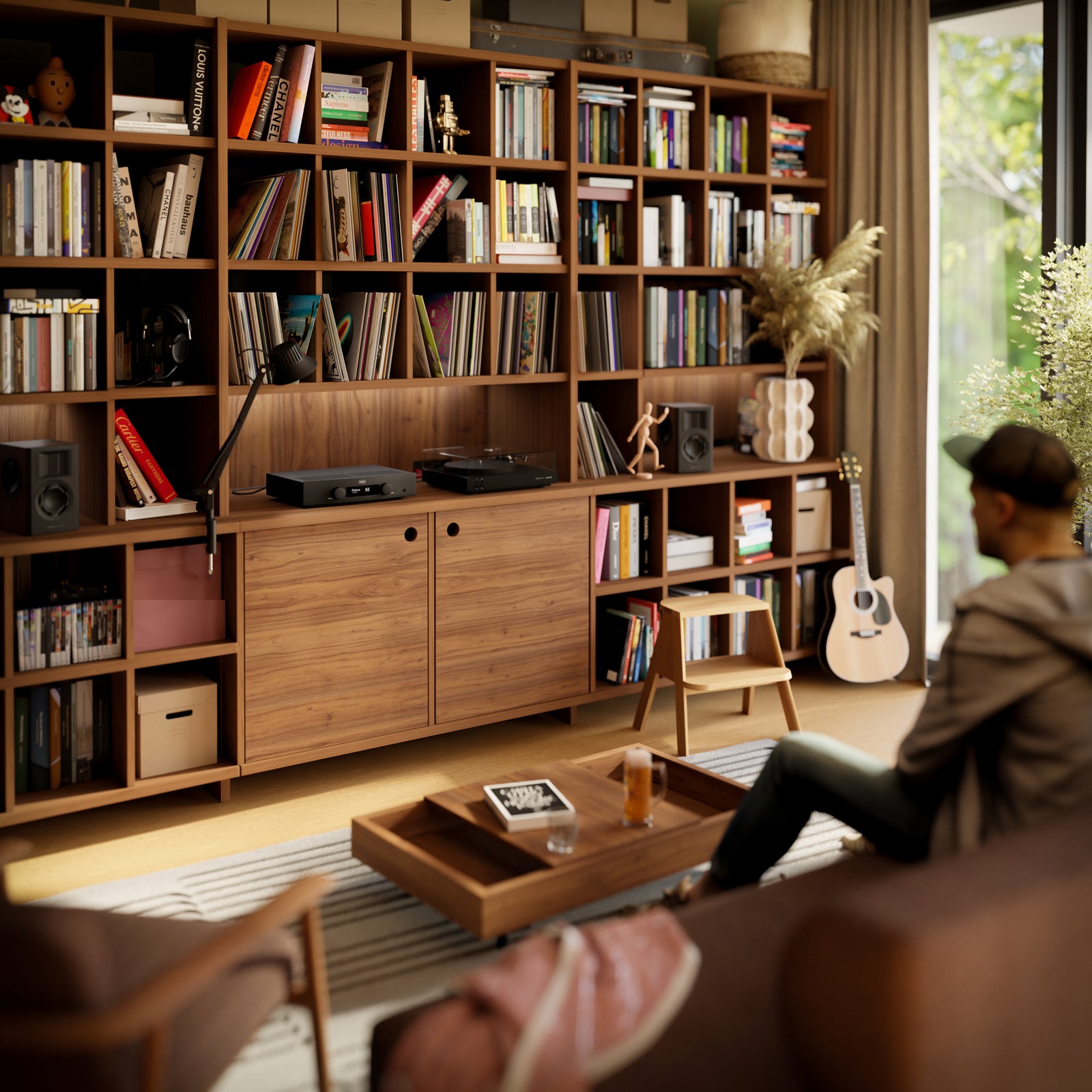 While the H150 is a full-width amplifier designed to match standard hi-fi components, its depth of just 35 cm makes it easy to place on or into most shelves and media cabinets. Available in both black and white, the H150's clean, understated design complements any interior. Its robust construction includes a thick, precision-milled aluminum front panel and control knobs, with a steel top cover perforated with heat vents, adding to its compact, modern look. A central OLED display provides clear readouts from a distance and can be dimmed or turned off entirely to suit your environment.